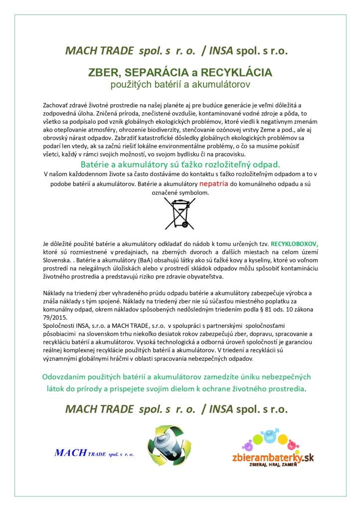 Je dôležité použité batérie a akumulátory odkladať do nádob k tomu určených tzv. RECYKLOBOXOV, ktoré sú rozmiestnené v predajniach, na zberných dvoroch a ďalších miestach na území našej obce / mesta a na celom území Slovenska.